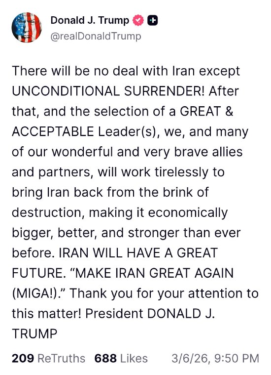 特朗普Truth Social发帖称,“除非无条件投降,否则不会与德黑兰达成任何协议”。