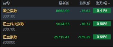 今日港股三大指数集体低开,恒指开盘跌0.69%,报25719.47点,恒科指跌0.6%,国企指数跌0.41%。盘面上,科网股普跌,哔哩哔哩跌超2%,阿里巴巴、快手、美团、联想跌超1%;证券及经纪板块低开,国泰君安国际跌超4%;黄金股回调,中国黄金国际跌超1%;油气设备与服务股高开,山东墨龙涨超14%。