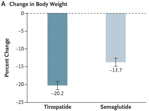 看疗效,差距已经清晰分层。头对头研究给出了最直接的参照系:2025年5月《新英格兰医学杂志》发表的SURMOUNT-5试验显示,礼来替尔泊肽72周减重20.2%,显著优于诺和诺德司美格鲁肽的13.7%[citation:4][citation:5]。