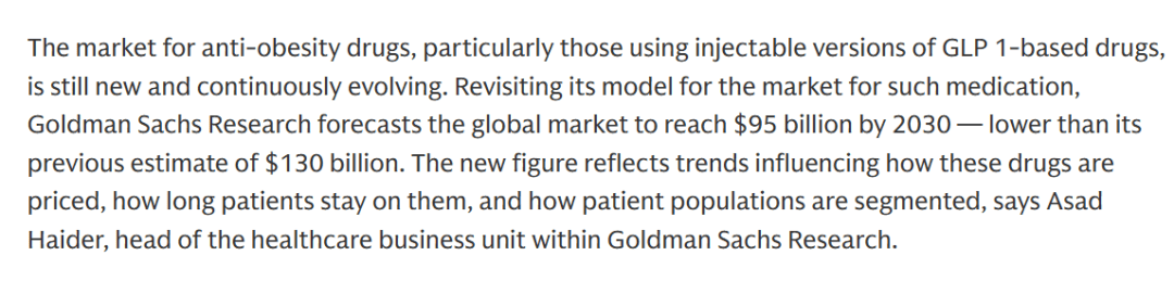 另一边,高盛2025年医药报告预测,2030年全球GLP-1减肥药市场规模破千亿。