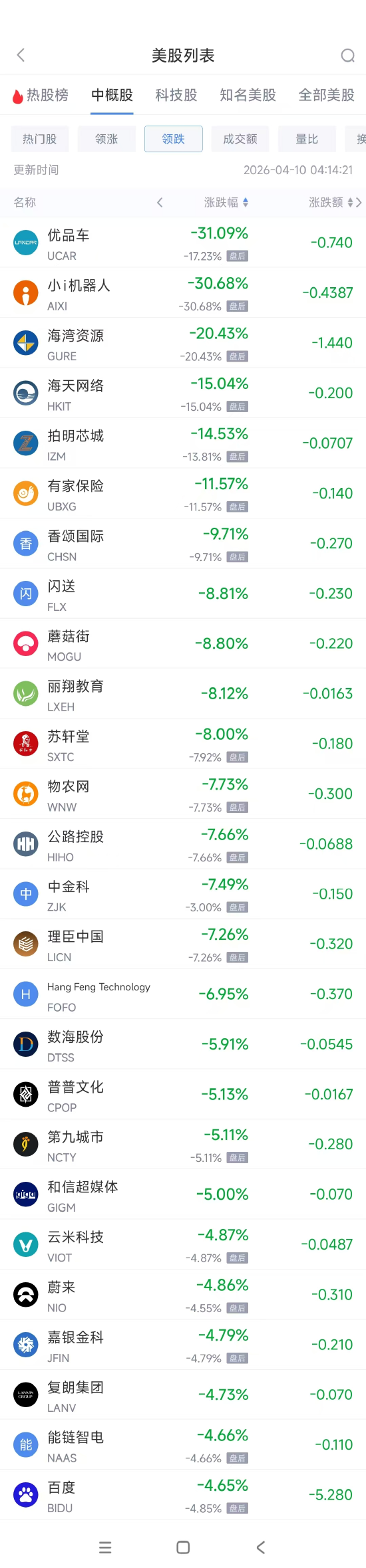 4月10日热门中概股多数下跌 蔚来跌4.86%,百度跌4.65%