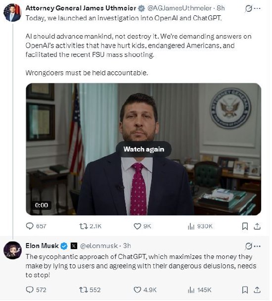 美国佛州总检察长宣布调查OpenAI,马斯克回应