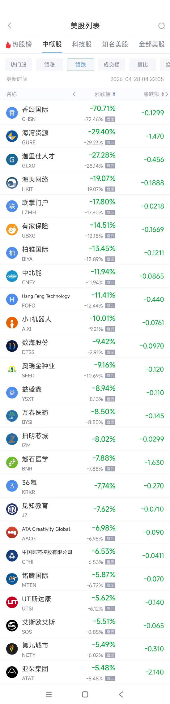 领跌中概股列表: