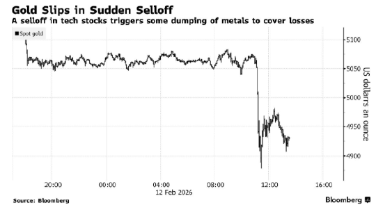 市场解读,受人工智能颠覆性因素影响,股市避险情绪开始蔓延,金属价格突然下跌,这看起来像是算法抛售所致。部分抛售可能也源于获利回吐,因为这两种金属最近一次的迅猛上涨部分是由投机性买盘推动的。此外,追加保证金也可能加剧了抛售,一些投资者被迫平仓包括金属在内的大宗商品头寸以提供流动性。