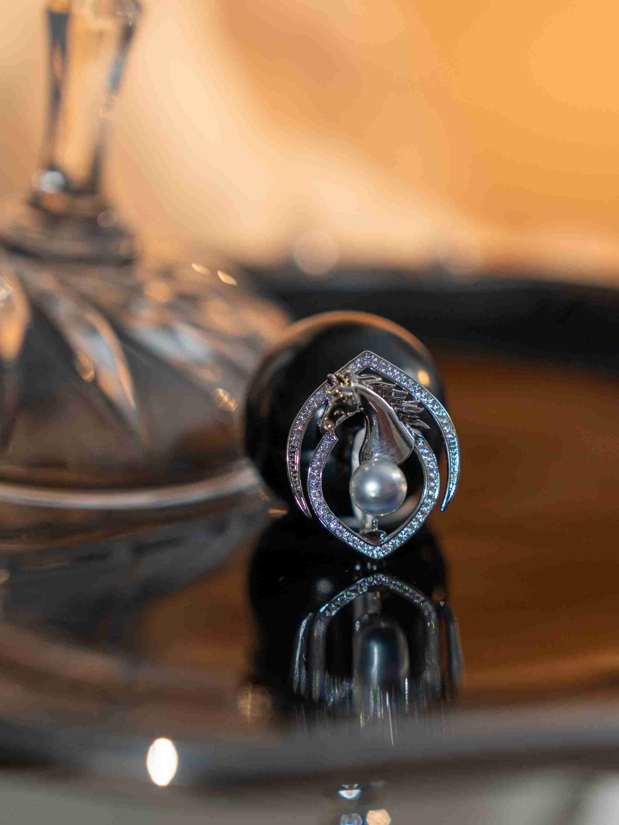 MiNG名皇珠宝将进取之志凝结于“飞骏(马年生肖系列)-以梦为马真多麻胸针”。设计师提取骏马昂首跃起的动态瞬间,用利落的立体金属线条勾勒骏马轮廓,无多余装饰,却让“进取”的姿态跃然眼前。冷调的真多麻珍珠嵌于骏马与满钻围边的衔接处,平衡整体造型,珠光泛着银蓝晕彩,与周边的银光材质形成细腻碰撞,既有金属的力量感,又有珍珠的温润感。新年别在大衣翻领上,是对“以梦为马”的自我期许;日常搭配针织衫,又成低调的品位点缀。不仅是“新年限定”,更是能陪伴一整年的精神徽章。