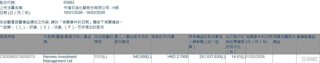 格隆汇2月16日丨根据联交所最新权益披露资料显示,2026年2月11日,中海石油化学(03983.HK)获Hermes Investment Management Ltd在场内以每股均价2.78港元增持34万股,涉资约94.52万港元。
