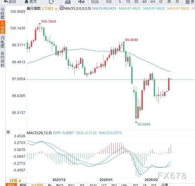 从技术面来看,美元指数在日线图上延续反弹走势,并突破前期短线压力位,重新站稳97.50上方。当前走势呈现“突破后整理”的结构特征。