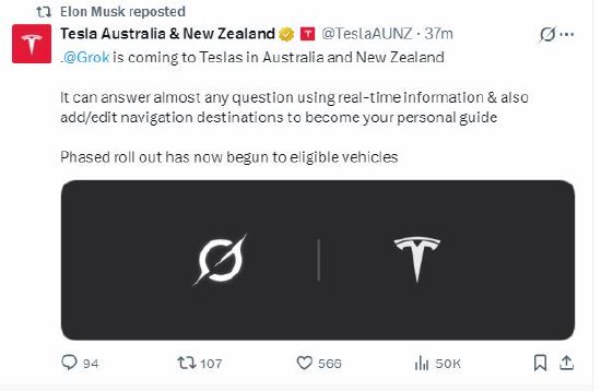 特斯拉官方账号在X上发帖称:“Grok即将登陆澳大利亚和新西兰的特斯拉汽车。它能够利用实时信息回答几乎任何问题,并且还能添加/编辑导航目的地,从而成为您的私人向导。目前已开始分阶段向符合条件的车辆推送。”