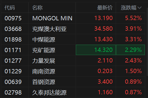 港股煤炭股逆势上涨,其中,兖煤澳大利亚盘中一度涨近8%刷新阶段新高,中煤能源涨超3%同样创阶段高位,兖矿能源、力量发展涨超2%,南南资源、首钢资源跟涨。