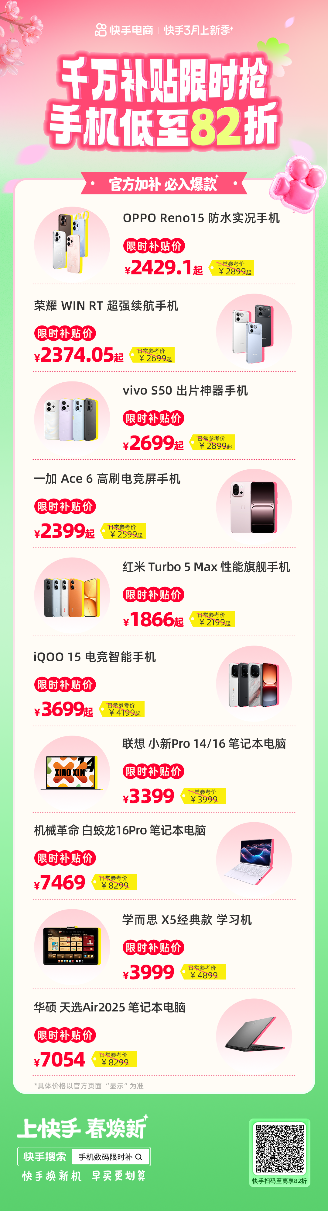 近期,由于存储芯片成本持续攀升,“手机行业将迎5年来最大涨价潮”等话题持续升温,引发市场关注。3月3日,快手3月上新季加码千万补贴,联动多家手机数码品牌推出专属购机福利,限时购机至高可享82折,为用户提前锁定涨价潮前消费窗口期。