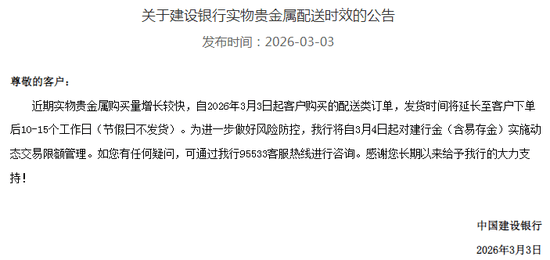 另外,上述公告还显示,近期实物贵金属购买量增长较快,自2026年3月3日起客户购买的配送类订单,发货时间将延长至客户下单后10-15个工作日(节假日不发货)。