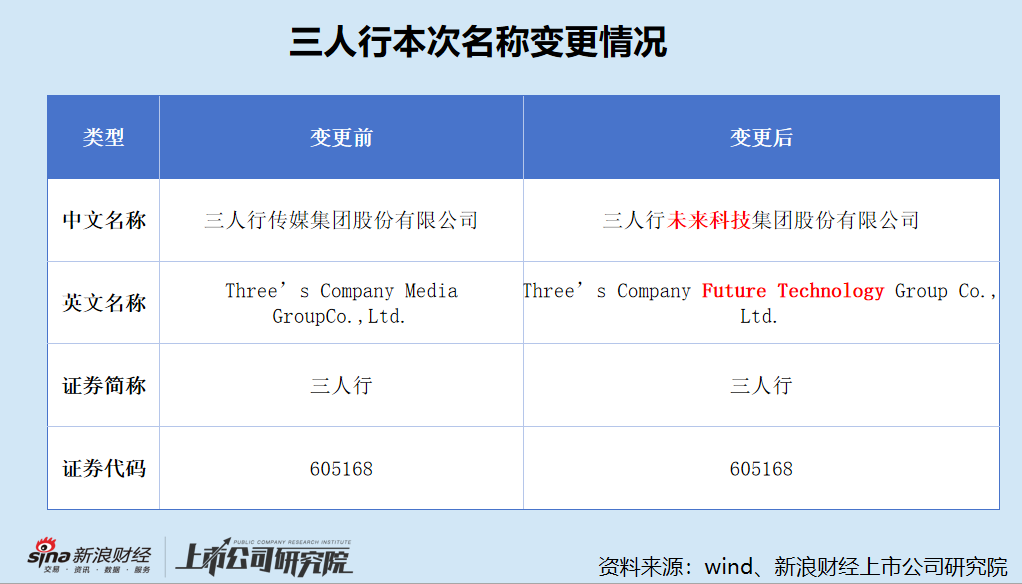 2026年3月7日, 三人行传媒集团股份有限公司(简称“三人行”或“公司”)发布公告称,拟将中文名称变更为“三人行未来科技集团股份有限公司”,英文名称“Three’s Company Media GroupCo.,Ltd.”变更为“Three’s Company Future Technology Group Co., Ltd.”,行业分类“商务服务业”(L72)变更为“互联网数据服务”(I6450)。