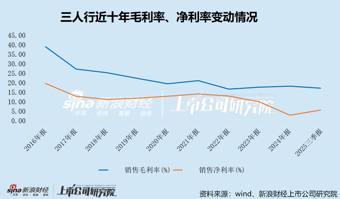 2025年前三季度,三人行的毛利率及净利率分别为17.18%、5.63%,分别同比下滑0.34个点、0.27个点,盈利能力仍未实质性修复。ROE再下探,同比下降1.12个百分点至5.39%。
