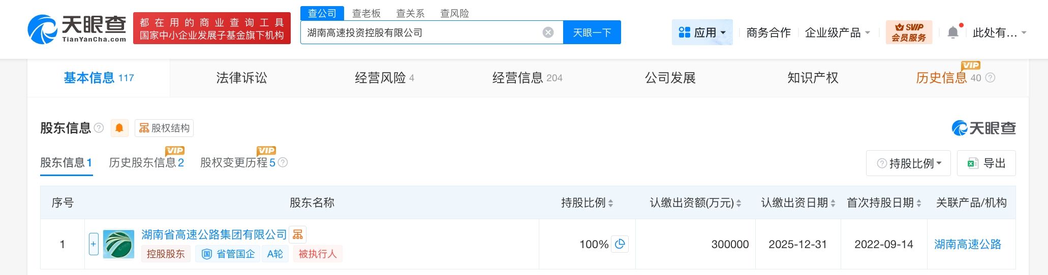 该公司成立于2010年12月,法定代表人为林东球,经营范围为以自有资金从事投资活动、自有资金投资的资产管理服务、企业管理、工程管理服务、对外承包工程、创业投资。股东信息显示,该公司由湖南省高速公路集团有限公司全资持股。