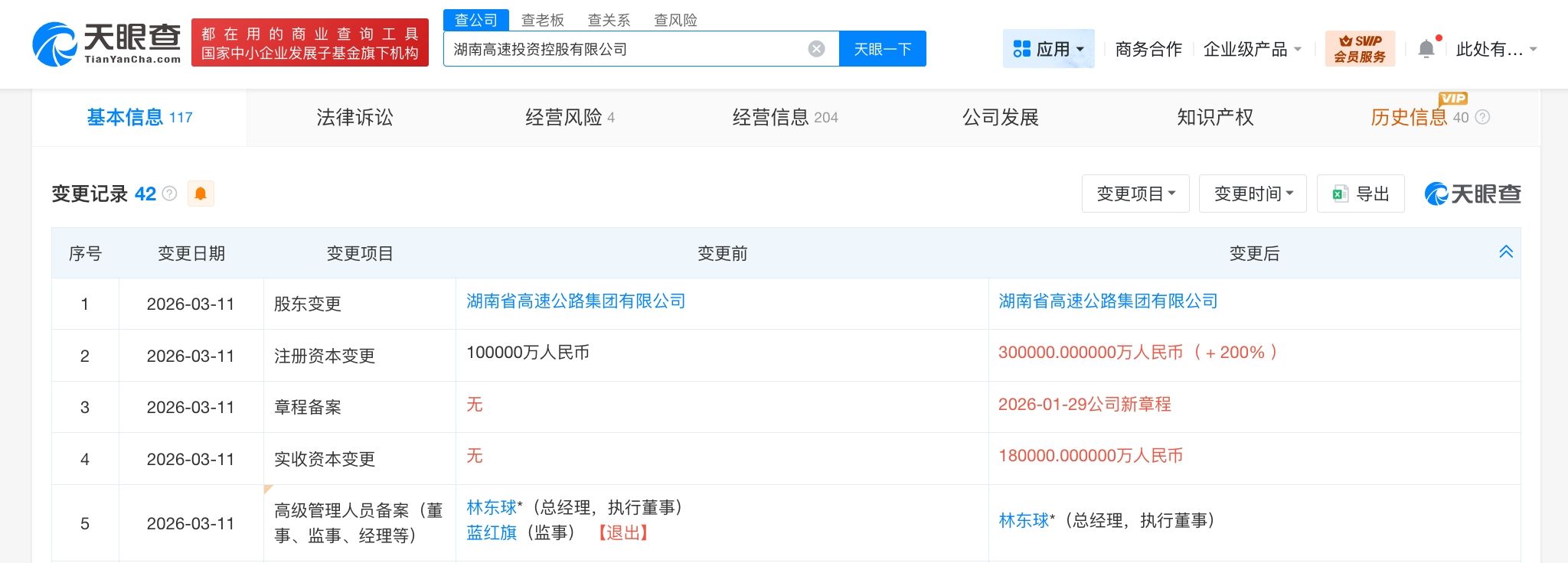 天眼查工商信息显示,近日,湖南高速投资控股有限公司发生工商变更,注册资本由10亿人民币增至30亿人民币,增幅200%。