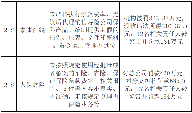 其中最引人注目的是两张“千万级”罚单:2月8日,人保财险因未按规定使用条款费率、报告文件不真实等问题,机构及相关责任人被合计罚款1299万元,27名责任人被追责;同日,泰康在线因类似原因被罚没1164.74万元。这两张同日抛出的重磅罚单,宣告了监管对行业头部公司违规行为同样实施“零容忍”的坚决态度。