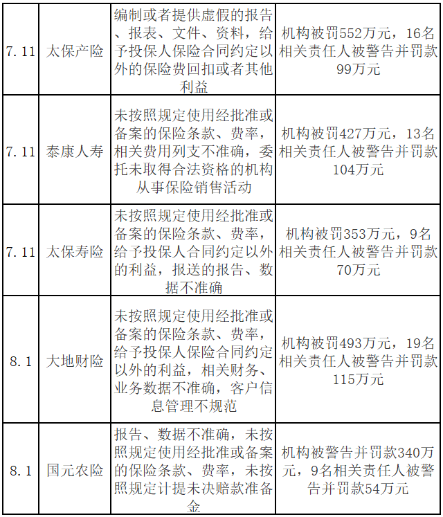 天安人寿,12人被罚款99万元,3人终身禁业,1人10年禁业,1人5年禁业,4人3年禁业;