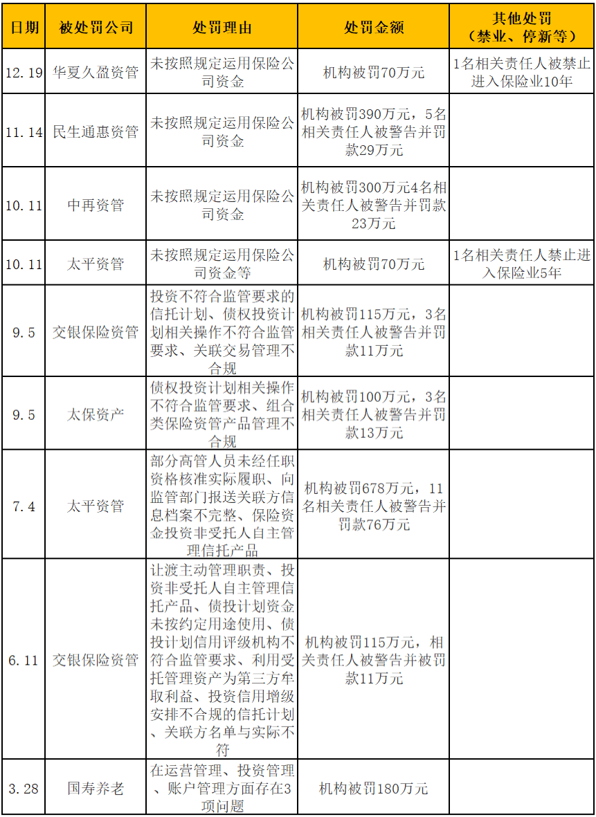 针对资管机构的罚单显著增加,是今年监管行政处罚的一个显著特色,全年共有9家保险资管公司吃罚单。