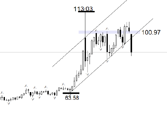 行情方面,ATFX分析师认为,日线级别,美原油今日暴跌,长阴线已经突破上升通道下轨,由于突破后行情向下运行了较长距离,目前基本可以判定突破有效。目前看来,3月9日形成的高点113.03作为中期阻力位依旧有效,接下来的下跌波段将会寻找新的中期支撑位,也就是中期的低点。如果美国和伊朗之间的谈判,最终在两周之后达成长期和平协议,那么前一个中期低63.58美元就极有可能被刷新。