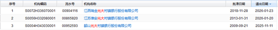 除了江西瑞金光大村镇银行,光大银行旗下的江苏淮安光大村镇银行于今年1月20日退出;韶山光大村镇银行于去年11月11日退出。
