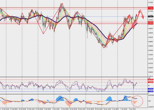 技术面:澳元兑美元H4级别持续反弹,并在48日多空分界线上方运行。此外,MACD双线和量能柱在零轴上方收敛。澳大利亚储备银行货币政策委员会将于5月4-5日召开下次会议,预计5月将再次加息25个基点,下半年可能还会有进一步行动。