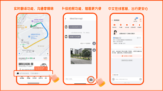 滴滴海外出行作为用户在海外旅途中贴心的同行者,中文界面,支持中/英文输入起终点,下单轻松又方便。滴滴App内还有实时翻译功能,让您在App上与海外司机沟通零障碍,无论是询问路线还是分享旅途趣事,都能畅所欲言,部分城市还试行通过App内消息给司机发照片功能,司机接你更方便。更有7×24小时中文在线客服,随时为您解决行程中的疑问,让您在国外也能感受到家的温暖。
