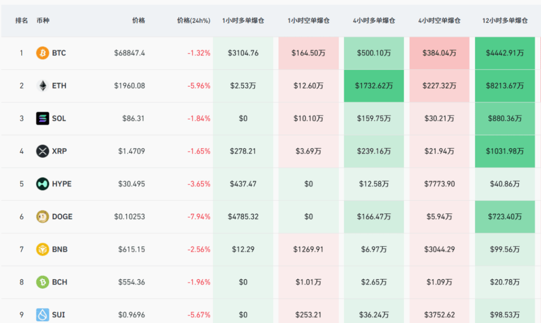 从昨天晚上开始,虚拟币再度走弱。比特币一度跌破6.9万,以太坊更是大跌近6%,并再度跌破2000美元。其他主要币种集体杀跌。根据CoinGlass数据统计,最近24小时,全球共有117523人被爆仓,爆仓总金额为3.32亿美元。
