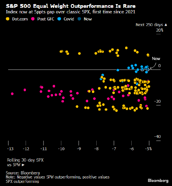 标普500等权重指数在滚动30日区间内的表现跑赢标普500指数超过5个百分点,幅度为新冠疫情以来首见。