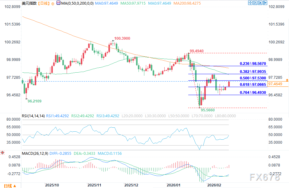 美元指数在消息发酵后进一步走高,本轮拉升至97.522阻力位,主要受万斯相关言论推动。
