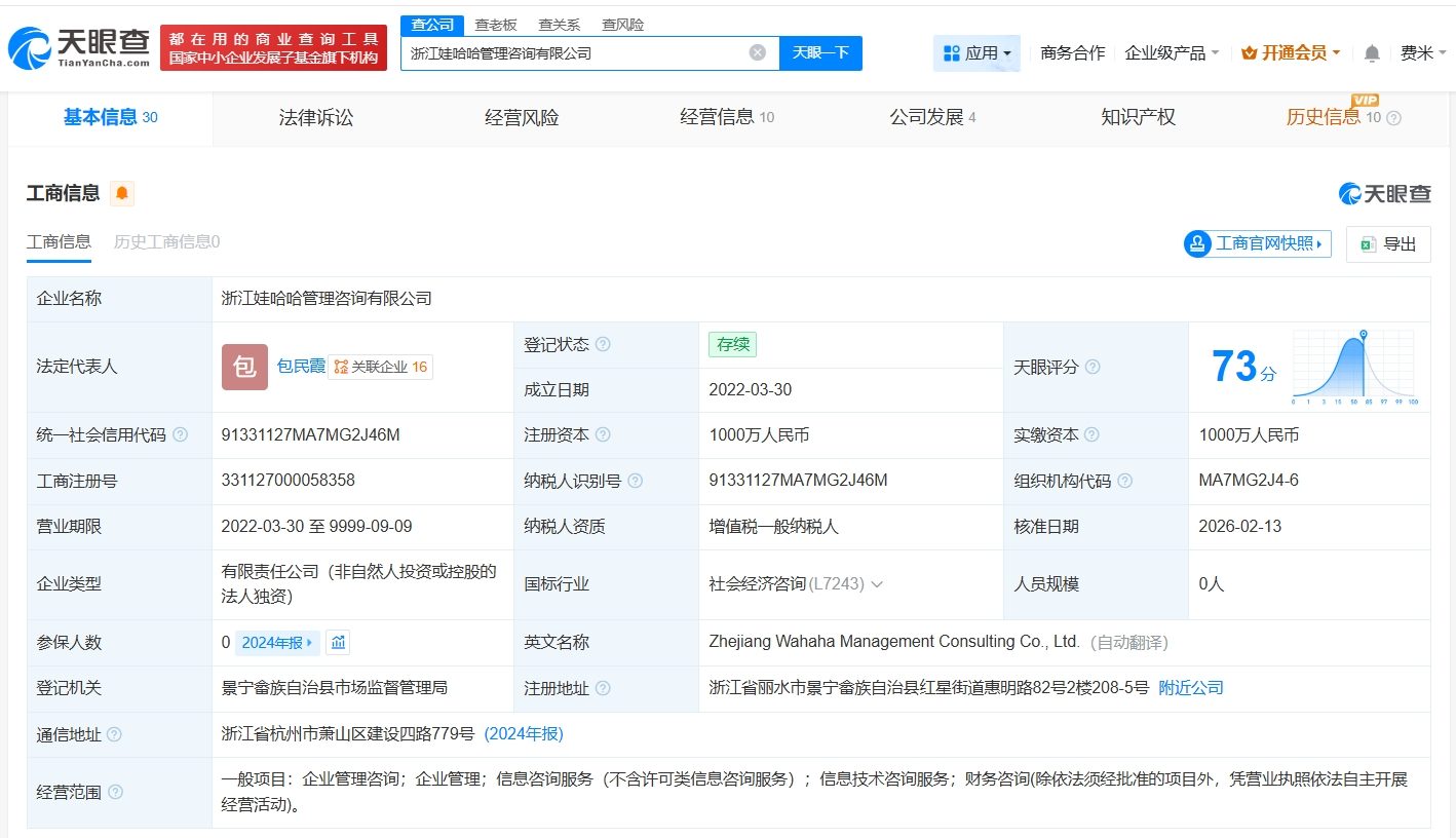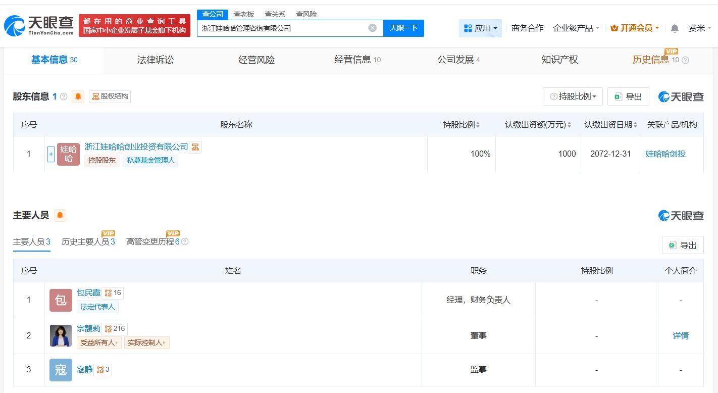 浙江娃哈哈管理咨询有限公司成立于2022年3月,注册资本1000万人民币,经营范围包括企业管理咨询、企业管理、信息咨询服务等。股东信息显示,该公司由浙江娃哈哈创业投资有限公司全资持股。