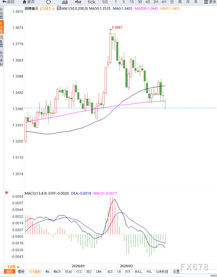 MACD指标维持在零轴下方运行,空头动能仍占据优势。若价格反弹,首先需要关注1.3450阻力区间;若该位置突破失败,汇价可能继续下探。