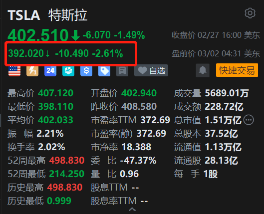 美股异动丨特斯拉盘前跌2.6% 2月在挪威、法国新注册量同比下降88%及14.7%
