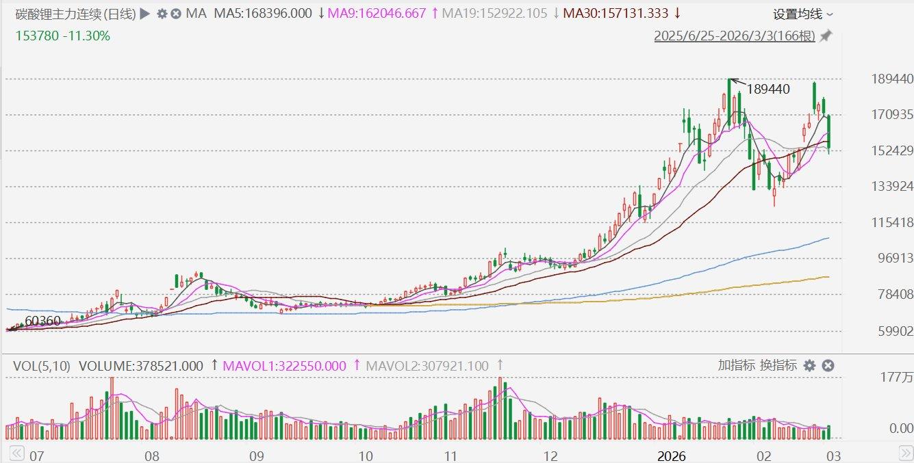 A股市场锂矿股集体下挫,其中,华友钻业、中矿资源跌超6%,西藏珠峰、西部矿广业跌超5%,藏格矿业、尔康制药、赣锋锂业、盐湖股份、天齐锂业跌超4%。消息面上,碳酸锂主力合约今日大跌,盘中一度触及跌停,跌幅12.99%,报150860元/吨。