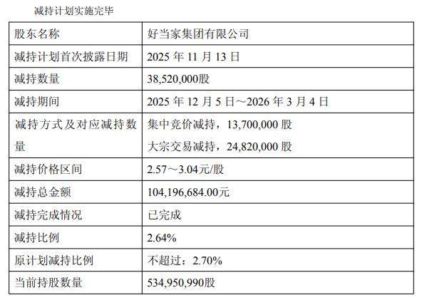 2026年3月4日,公司收到好当家集团出具的《关于股份减持计划实施完毕的告知函》,截至2026年3月4日的减持期间内,好当家集团通过集中竞价方式减持公司股份13,700,000股、大宗交易减持方式减持公司股份24,820,000股,累计减持公司股份38,520,000股,占公司总股本的2.64%,本次减持计划已实施完毕。