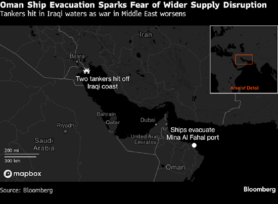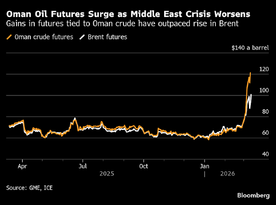 荷兰国际集团(ING)大宗商品策略主管沃伦・帕特森表示,阿曼出现的供应中断“引发了市场对更广泛区域供应的担忧”。“市场将不得不开始担心,受影响的不再只是霍尔木兹海峡的石油运输。”