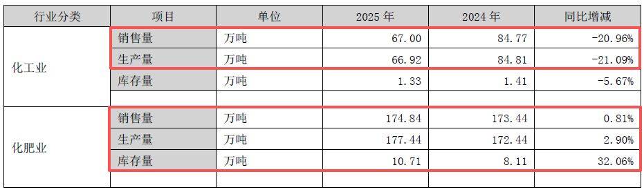 尽管泸天化2025年实现了归母净利润正增长,但《每日经济新闻》记者(以下简称“每经记者”)注意到,公司两大主业的营收均出现下滑:从行业来看,化肥行业收入同比下降8.54%,化工行业收入同比大降20.73%,主营业务面临较大缩量压力。