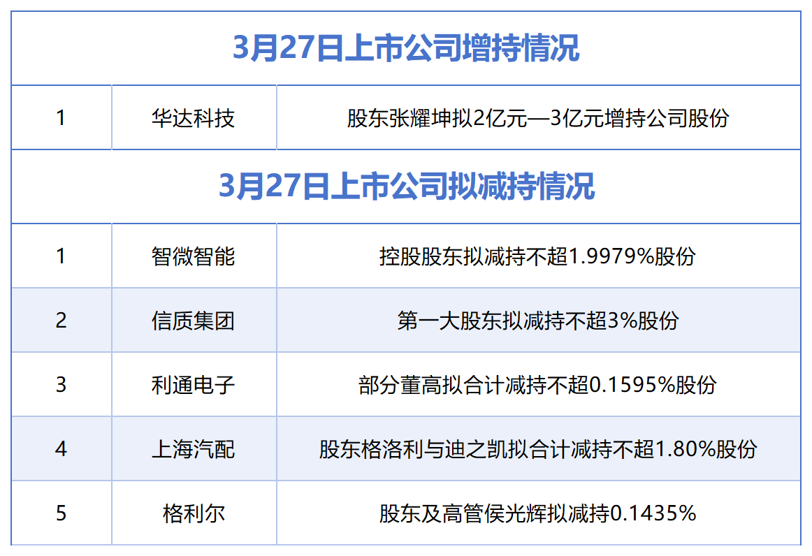3月27日增减持汇总:华达科技披露增持情况,智微智能等5股拟减持(表)