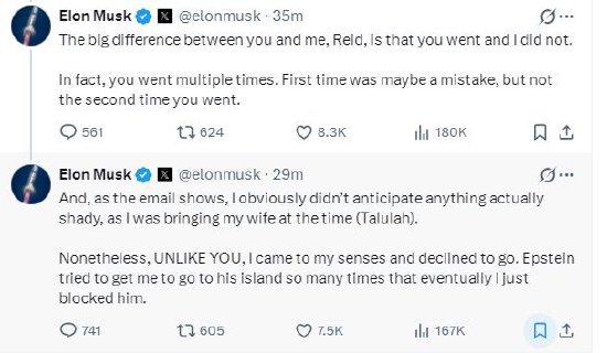 马斯克在X上回应卷入爱泼斯坦丑闻的Linkdin联合创始人、微软董事里德·霍夫曼的帖子时称:“里德,你和我最大的区别在于你去了(萝莉岛),而我没有。事实上,你去了好几次。第一次或许是个错误,但第二次就不是了。