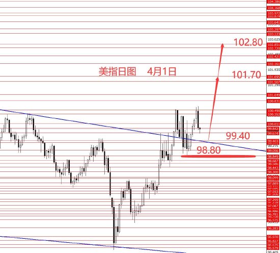 4月1日,美指上个月震荡上行,月线收大阳柱。从图形来看,美指中线反弹行情正如预期,而且这波行情还没走完,本月继续上行的概率较大些,下方关注98.80强支撑,以上中线继续看涨。若跌回至98.80下方则重新分析重新来过。操作建议99.40附近做多,止损98.70,目标看向101.70和102.80区域。控制仓量,严格止损。