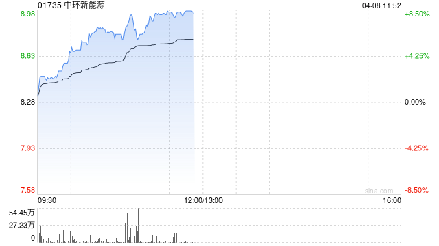 中环新能源(01735)午前涨超8%,截至发稿,股价上涨8.21%,现报8.96港元,成交额6875.13万港元。