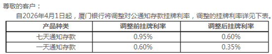 例如,厦门银行3月30日发布公告称,自4月1日起,该行将调整对公通知存款挂牌利率。其中,七天通知存款从0.95%降至0.60%,下调35个基点;一天通知存款从0.60%降至0.35%,下调25个基点。