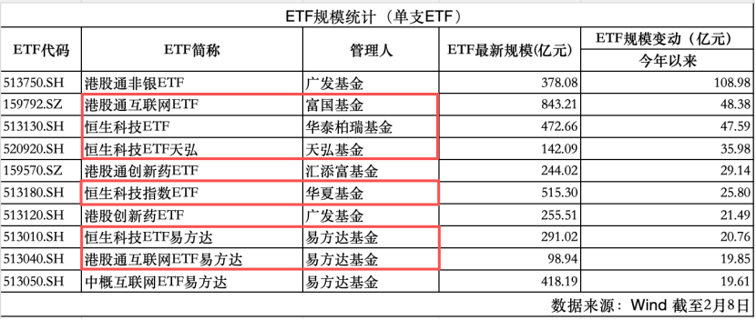 值得注意的是,平安基金管理的港股通科技ETF是2月3日才上市的新基金,也受到了市场热捧,上市以来规模增长8.62亿元,体现出投资者布局港股的热情。