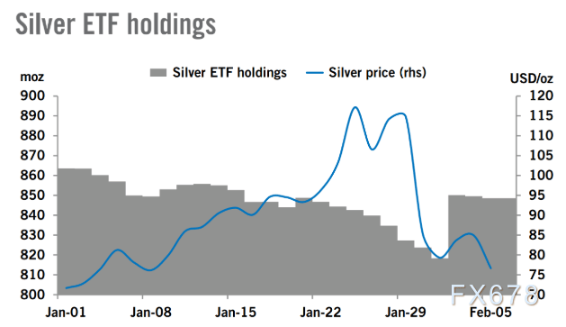 他们表示:“白银在1月30日的暴跌后最初出现反弹,但反弹势头在当周中段逆转,散户的逢低买入推动了大量资金流入白银ETF,仅2月4日ETF持仓就增加了近3200万盎司,使总持仓量回升至8.5亿盎司。”