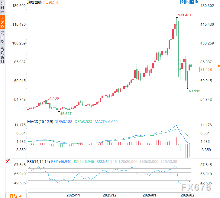 周二亚欧时段,现货白银震荡下行,现交投于每盎司81.69美元附近,日内跌幅约2%。