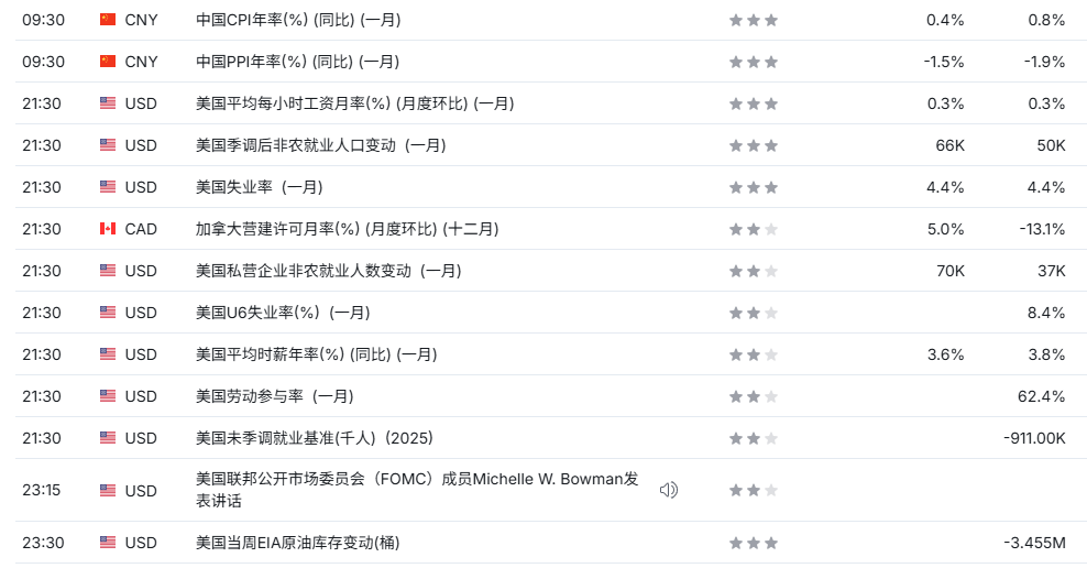 周三(2月11日)本周,美国1月非农就业数据与消费者物价指数将同步公布,这两份核心报告将直接决定美联储2026年降息节奏,甚至是否降息,成为市场判断美国经济与货币政策的关键依据。去年秋季,波动疲软的就业市场是美联储的核心顾虑,为对冲失业率上行、招聘大幅降温的风险,美联储在2025年末三次下调基准利率,全力稳住就业市场。如今,市场关注重心已重新转向居高不下的通胀问题。机构预测1月美国新增就业5.5万人,失业率维持4.4%,当前失业率是核心观测指标,经济仅需新增约5万个就业岗位,就能稳住低失业率,只要就业保持韧性,美国经济就能规避衰退风险。通胀方面,1月数据有望小幅放缓,机构预计整体及核心CPI环比均上涨0.3%,同比分别回落至2.5%。主流观点认为,2026年关税影响将逐步消退,住房成本、劳动力成本增速放缓,会推动通胀持续向2%的目标靠拢。但通胀仍存隐忧,美联储有官员直言通胀顽固停留在目标上方,加之1月企业集中调价,以及关税成本向消费者转嫁,通胀存在超预期上行的可能。美元指数回落至96.70;非美货币反弹,澳元兑美元涨至0.7120,欧元兑美元上行至1.1910附近,离岸人民币到达6.91。现货黄金反弹至5046美元附近,现货白银来到82.30美元附近。原油反弹至64.50美元附近。