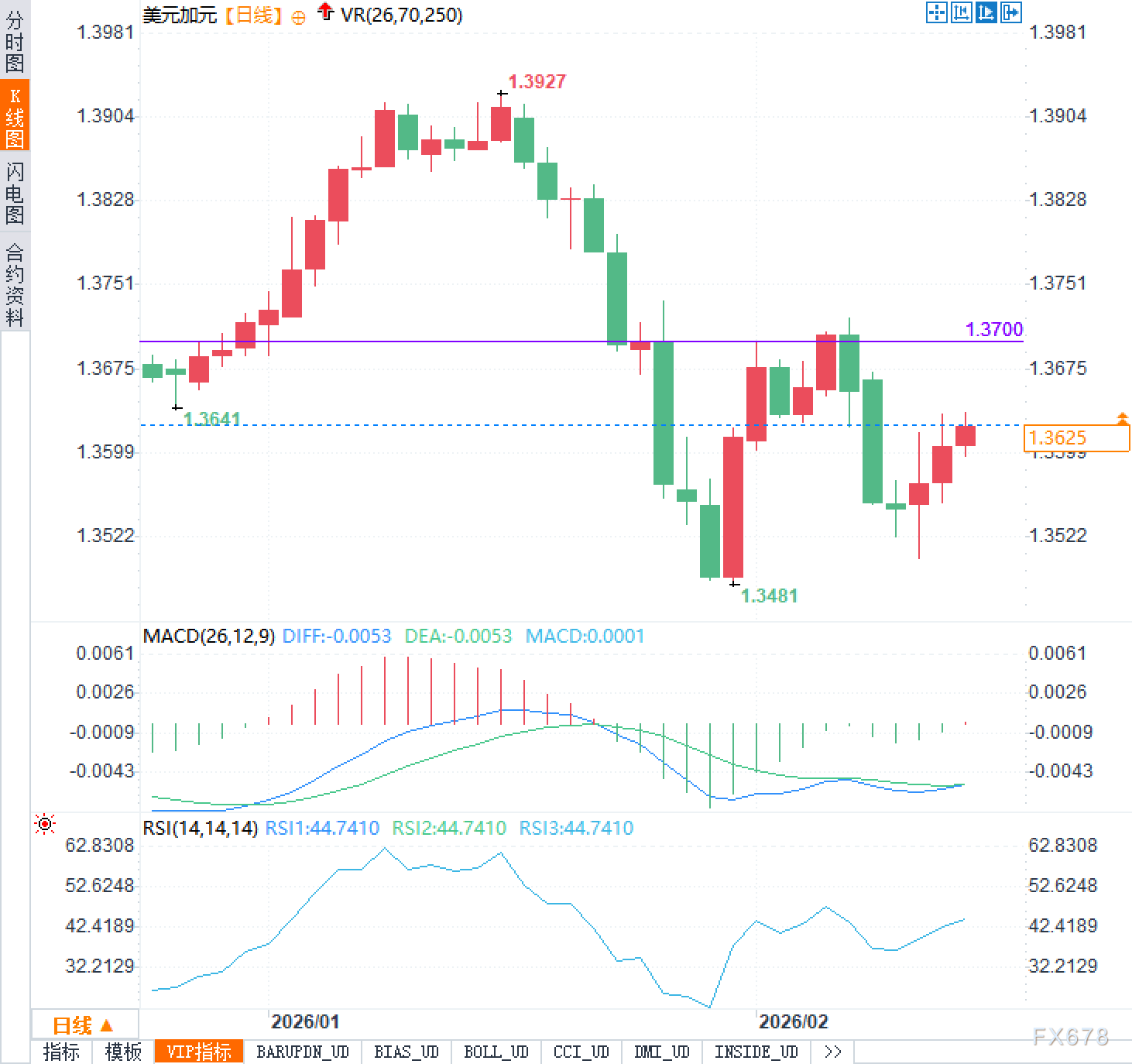 技术面上,汇价从前期高点1.3927回落,最低触及1.3481后反弹,显示出下方存在一定支撑。但随后在1.3700一线屡次受阻,表明上方抛压同样沉重。目前RSI指标位于44.7410,处于中性偏弱区域,既无极端超卖信号,也缺乏强劲买盘动能;MACD则贴近零轴运行,趋势信号模糊,进一步印证了方向不明的现实。