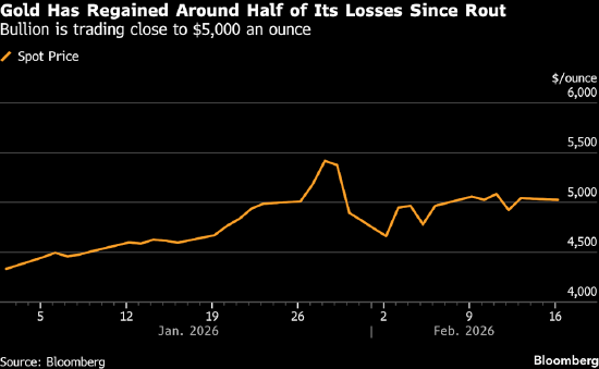 美国温和通胀数据推动金价重回每盎司5000美元上方后,交易商获利了结,金价随之走低。