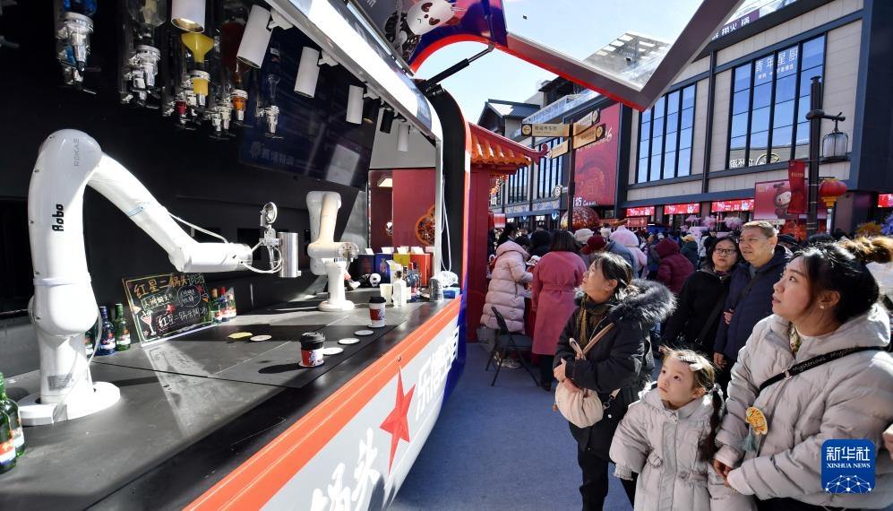 2月18日,北京隆福寺新春市集内的机器人饮料调配师吸引游客驻足。