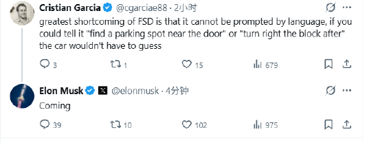 一位网友评论称:“FSD最大的缺点在于它无法通过语音来触发操作。如果你能告诉它“在门口附近找个停车位”或者“过一个街区后右转”,汽车就不用猜测了。”