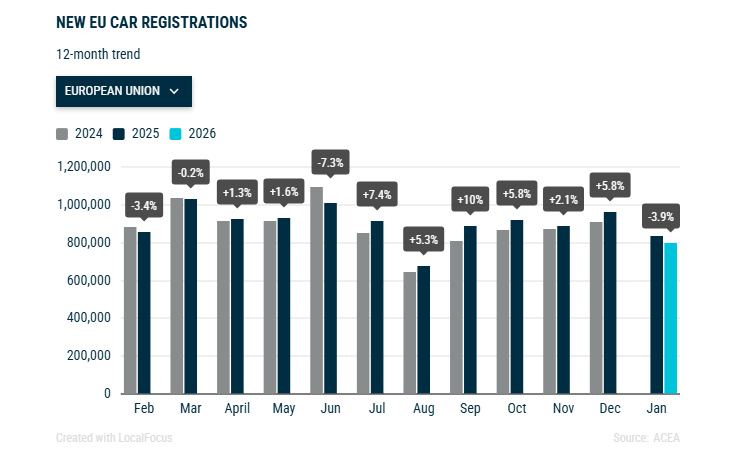 2026年1月,电动车注册了154,230辆。欧盟四个最大市场合计占电池电动车注册量的60%,表现参差不齐:法国(+52.1%)和德国(+23.8%)实现强劲增长,而比利时(-11.5%)和荷兰(-35.4%)则出现下降。